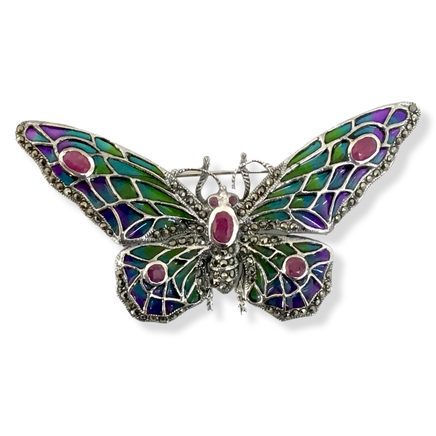 ALFINETE BORBOLETA ESMALTE EM PRATA, COM PEDRA NATURAL